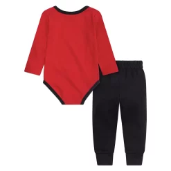 Keep your little future athlete’s look on trend with this baby boys’ graphic bodysuit and baby French terry joggers ensemble from Nike.