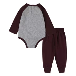 Your little future athlete will look just too sporty-cute in this baby boys’ raglan graphic bodysuit and baby French terry joggers ensemble from Nike.