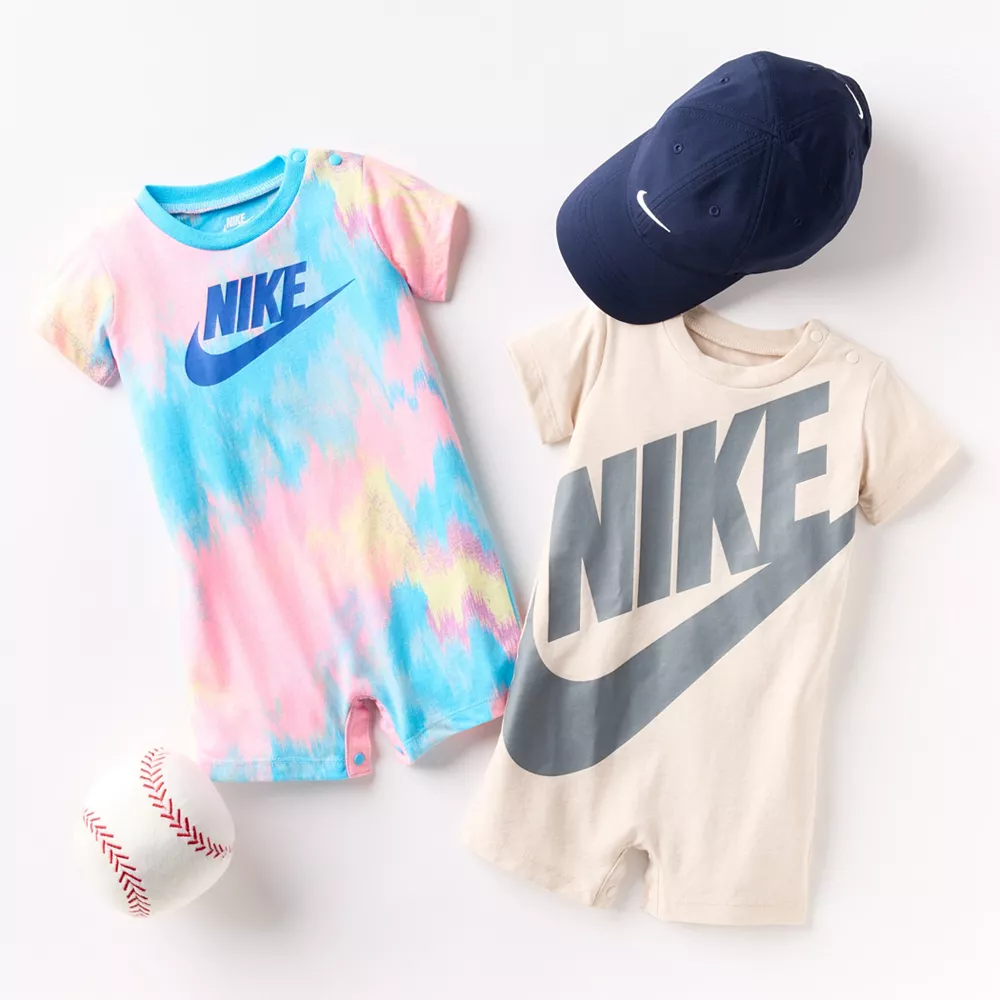 She’ll sport a winning look in this baby girl Nike Printed Club Romper.