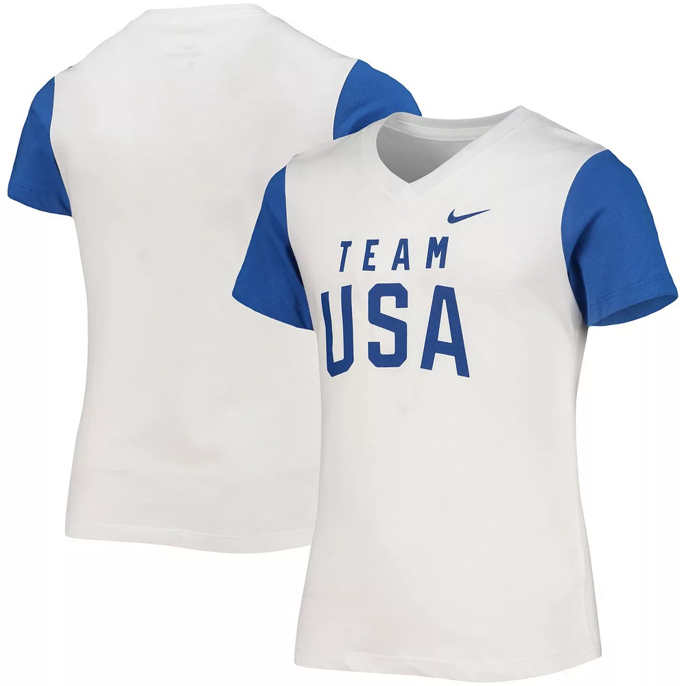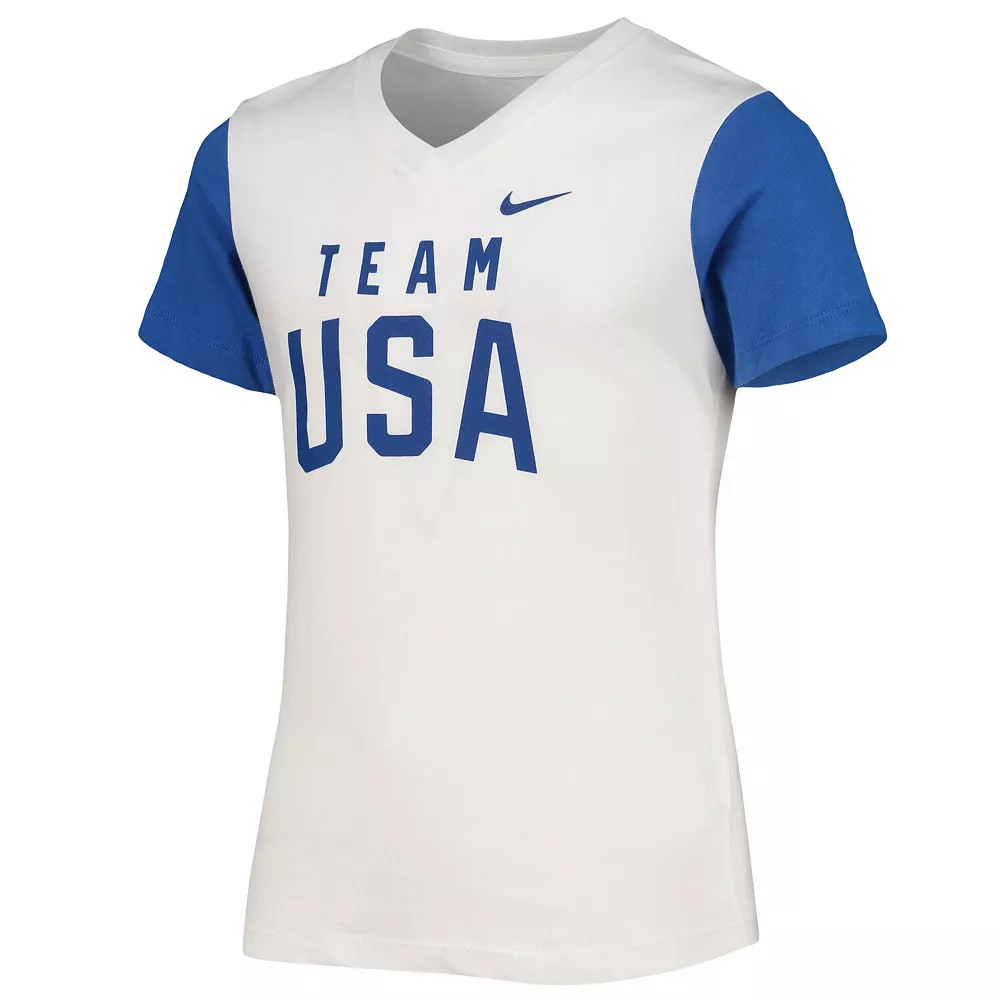 Help your kiddo rep Team USA’s top athletes in this V-neck tee from Nike. It features a soft cotton fabric perfect for cheering on the squad in comfort. Plus, its interesting color block design and bold graphics enhance your youngster’s Team USA pride in style.