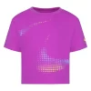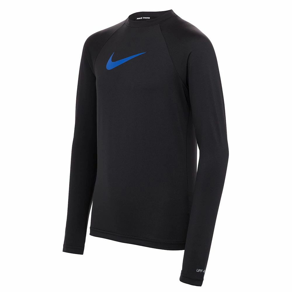 Keep her protected from the sun in the athletic style of this girls’ Nike swoosh long-sleeved hydroguard swim top.