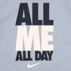 - Tee: “All Me, All Day” caption, crewneck, short raglan sleeves