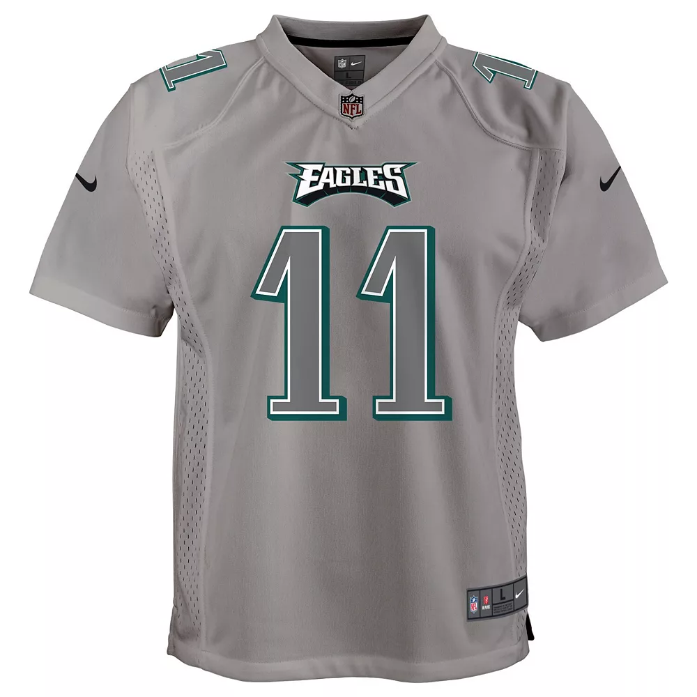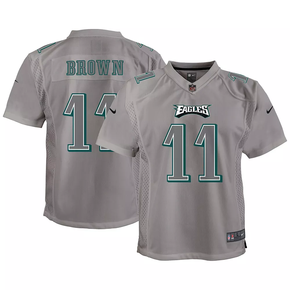 Up your youngster’s Philadelphia Eagles look with this A.J. Brown Atmosphere Game jersey by Nike. Its tailored fit is designed for movement, and mesh side panels ensure they stay cool and comfortable all day long. Authentic team details with a unique color palette make this replica jersey a standout piece in your young fan’s Philadelphia Eagles collection.