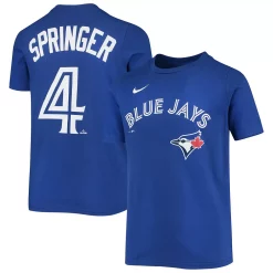 Give your kiddo a way to display support for their favorite baseball player with this George Springer Name and Number T-shirt from Nike. It features jersey-inspired Toronto Blue Jays graphics on the front and back. The lightweight fabric will also make this George Springer tee comfortable to wear for hours on end.