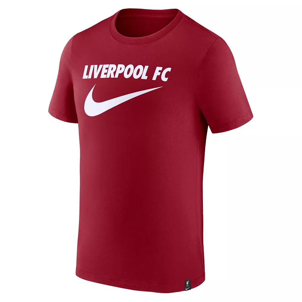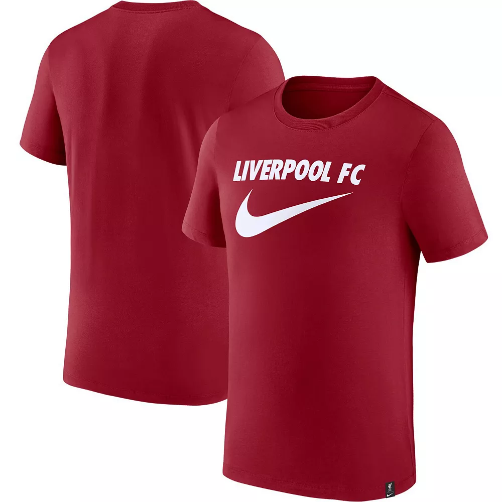 Help your kiddo proudly rep Liverpool with this Swoosh T-shirt from Nike. It features distinctive details and printed graphics, making it perfect for spirited match days. The soft cotton fabric maximizes comfort, ensuring your young fan feels great as they cheer on their club.