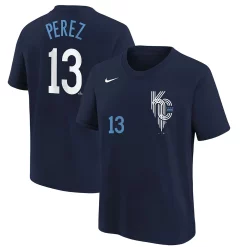 This special Kansas City Royals 2022 City Connect Salvador Perez Name & Number T-Shirt from Nike is inspired by the city’s most common nickname City of Fountains, claiming to have more fountains than any other city in the world. The colorway is a nod to the city’s ritual of dying the fountains when the Kansas City Royals makes a playoff run. The uniform draws from prominent Kansas City icons and pays tribute the beloved design of the city flag.