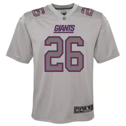 Up your youngster’s New York Giants look with this Saquon Barkley Atmosphere Fashion Game jersey by Nike. Its tailored fit is designed for movement, and mesh side panels ensure they stay cool and comfortable all day long. Authentic team details with a unique color palette make this replica jersey a standout piece in your young fan’s New York Giants collection.
